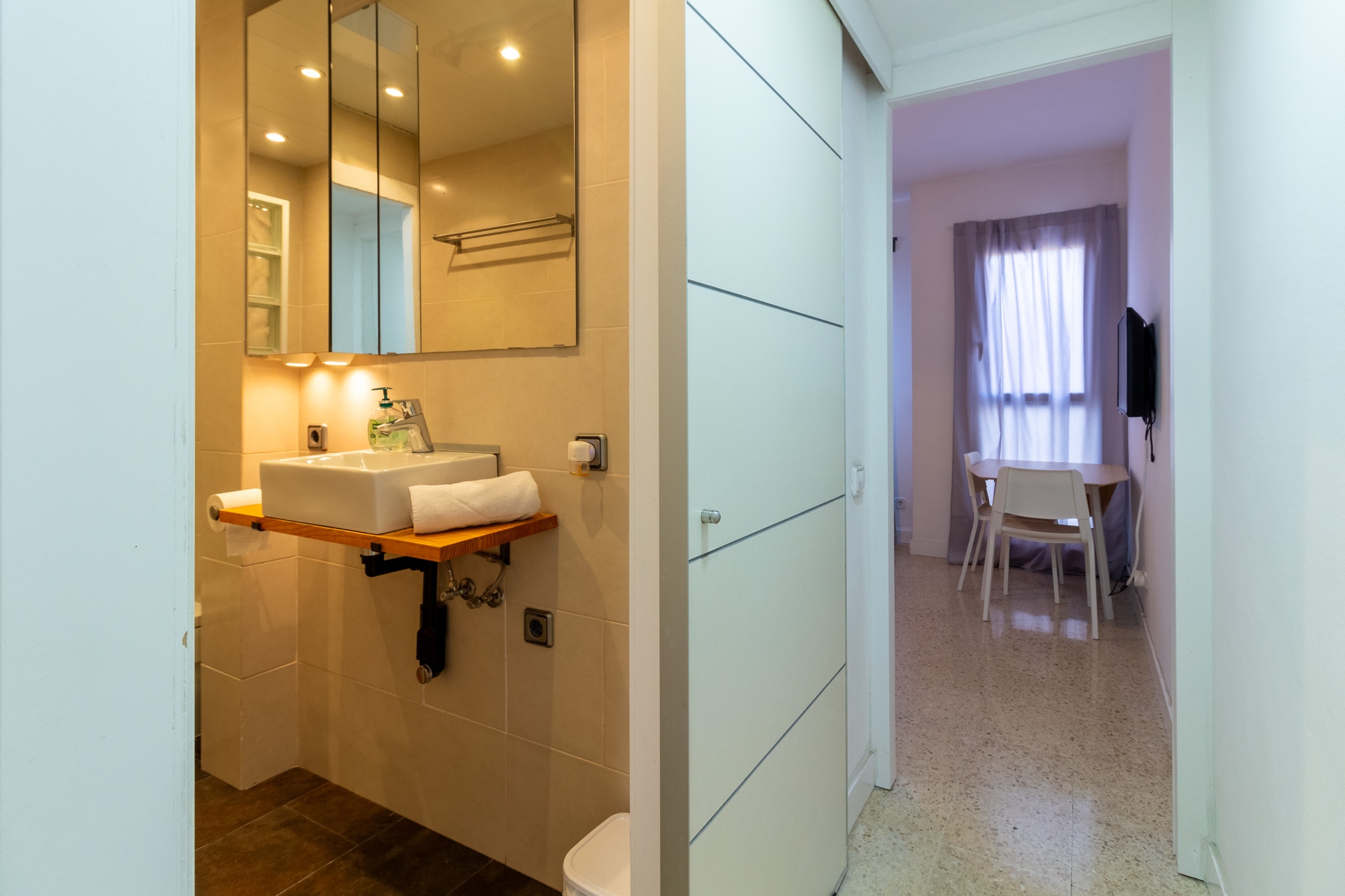 Ubicado en una finca con ascensor, una comodidad muy apreciada en el centro histórico, este espacio de 40 m² está diseñado para tu máximo confort. Al entrar, te recibirá un salón-comedor diáfano y funcional con una cocina abierta, ideal para preparar un desayuno antes de salir a explorar o disfrutar de una cena tranquila. Relájate en el cómodo sofá (que se convierte en cama doble) mientras ves la televisión o planificas tu próxima aventura con el Wi-Fi de alta velocidad.